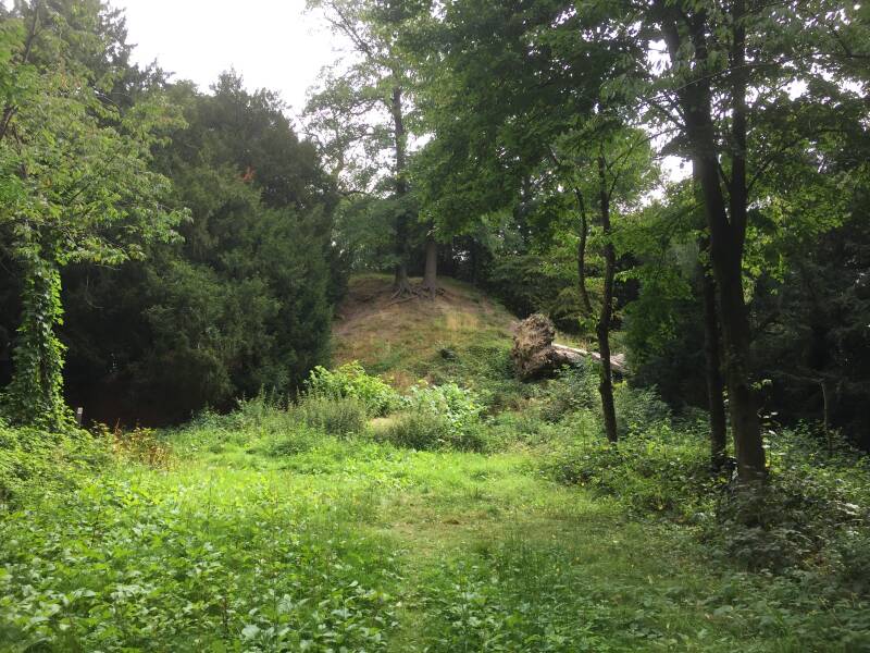 De interpretatie van deze heuvel als tumulus staat wat ter discussie. Hij zou pas in de 18de eeuw opgetrokken zijn als een tegenhanger van een tweede heuvel ten westen van het kasteel. Dat neemt niet weg dat hij op de kabinetskaart van Ferraris met het toponiem "Tombe" wordt aangeduid. Ook op de kaart van Vandermaelen (1846-1854) is de tumulus als dusdanig ingetekend.