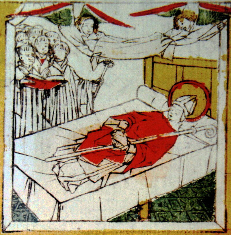 Foto: de dood van Sint-Servaas in Maastricht, uit het 15e-eeuwse Blokboek van Sint Servaas in de Koninklijke Bibliotheek van België.