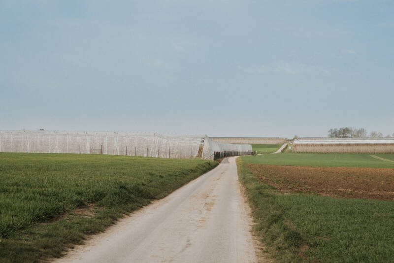 Fruitplantages afgedekt met plastic en hagelnetten tasten het uitzicht van de Romeinse weg sterk aan (2021)