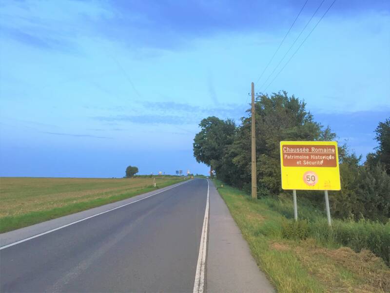 De Romeinse weg Tongeren-Bavay ter hoogte van Hoeve Brone. De Romeinse weg ligt er op een talud die nu bebouwd is (2019).