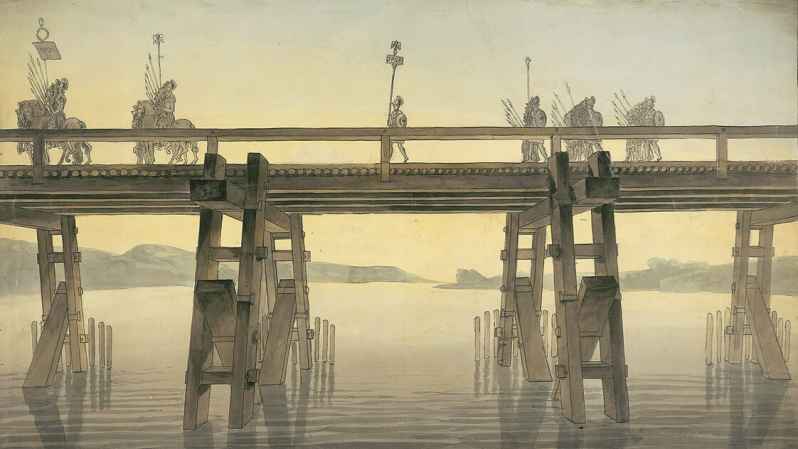 In zijn oorlogsverslagen beschrijft C. Iulius Caesar hoe hij in 55 en in 53 v.C. bruggen over de Rijn had geslagen om met enkele strafexpedities al te opdringerige Germanen een lesje te leren. Het was een enorme onderneming, zoals uit het verslag van de veldheer bleek:[1]